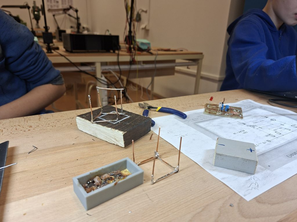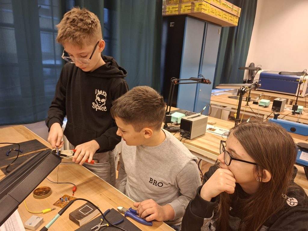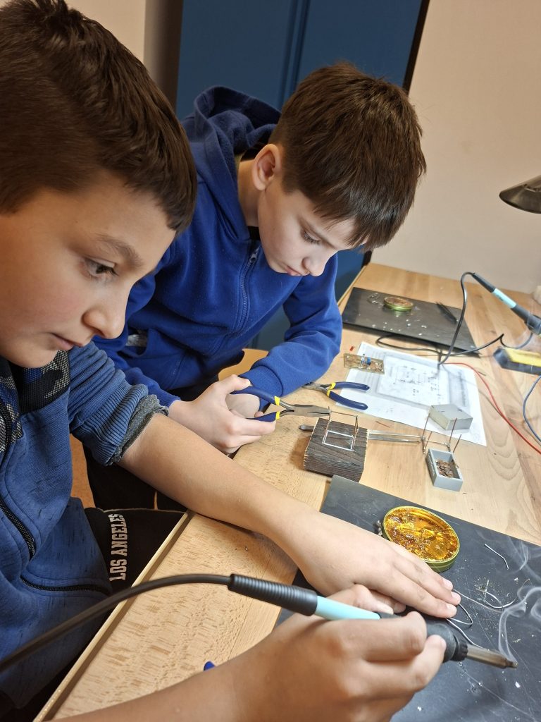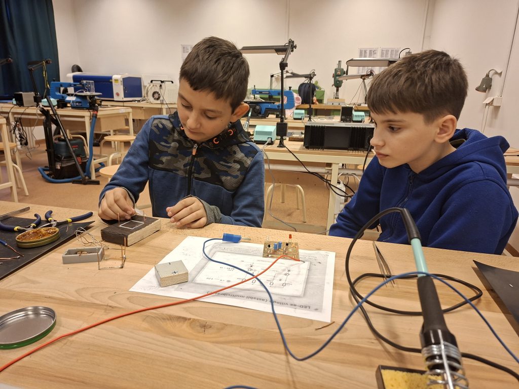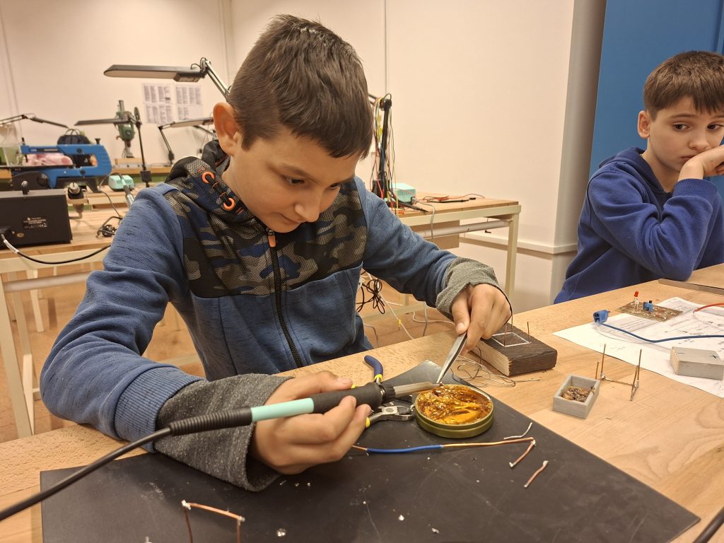 A program első részében a diákok forrasztópákát ragadtak és drótból kockát vagy pálcikafigurát készítettek, közben az alapvető elektronikai műveletekkel és a biztonságos eszközhasználattal is megismerkedtek. Ezzel a foglalkozással a műszaki gondolkodásukat, térlátásukat, és kézügyességüket tették próbára, megtapasztalták, milyen fontos a pontosság és a kitartás egy-egy alkotási folyamat során.